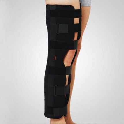 In anatomic compliance with the knee, the inner surface is made of cotton and outer surfaces is made of 2.5mm sticky raised neoprene fabric , there is circular knee strap around patella. the mediolateral section provide ease of movement with spiral springs. there are 5cm velcro tapes at the upper and the lower parts in order to fix it at the most optimum position for knee.