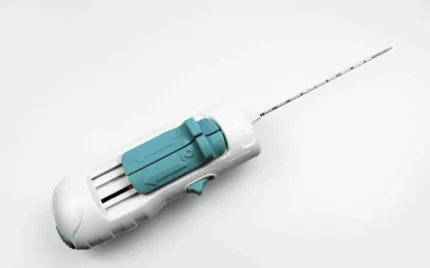 Disposable full automatic biopsy devices used for core samples from soft tissue and organs. This a guilotine type automatic biopsy needle with a stylet with sample notch and a cm marked echogenic cutting cannula.